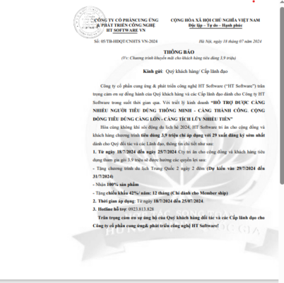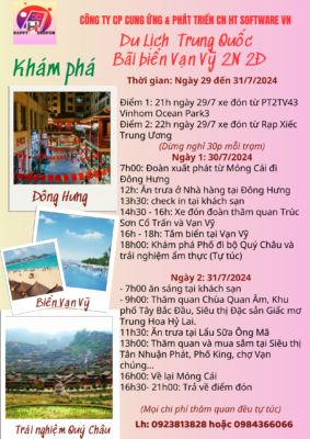 Để tiếp nối các chuyến đi và mang lại hành trình khám phá mới, HT Software VN tiếp tục đồng hành cùng quý khách hàng với gói đầu từ 3.9 triệu khách hàng sẽ được sở hữu chương trình du lịch 02 ngày 02 đêm tại Vạn Vỹ Trung Quốc, Thời gian đăng ký sắp kết thúc quý anh chị nhanh tay đầu tư để được hưởng quyền lợi cùng HT, Dưới đây HT xin gửi tới quý khách hàng anh chị thông báo cũng như lịch trình cụ thể của chuyến du lịch :